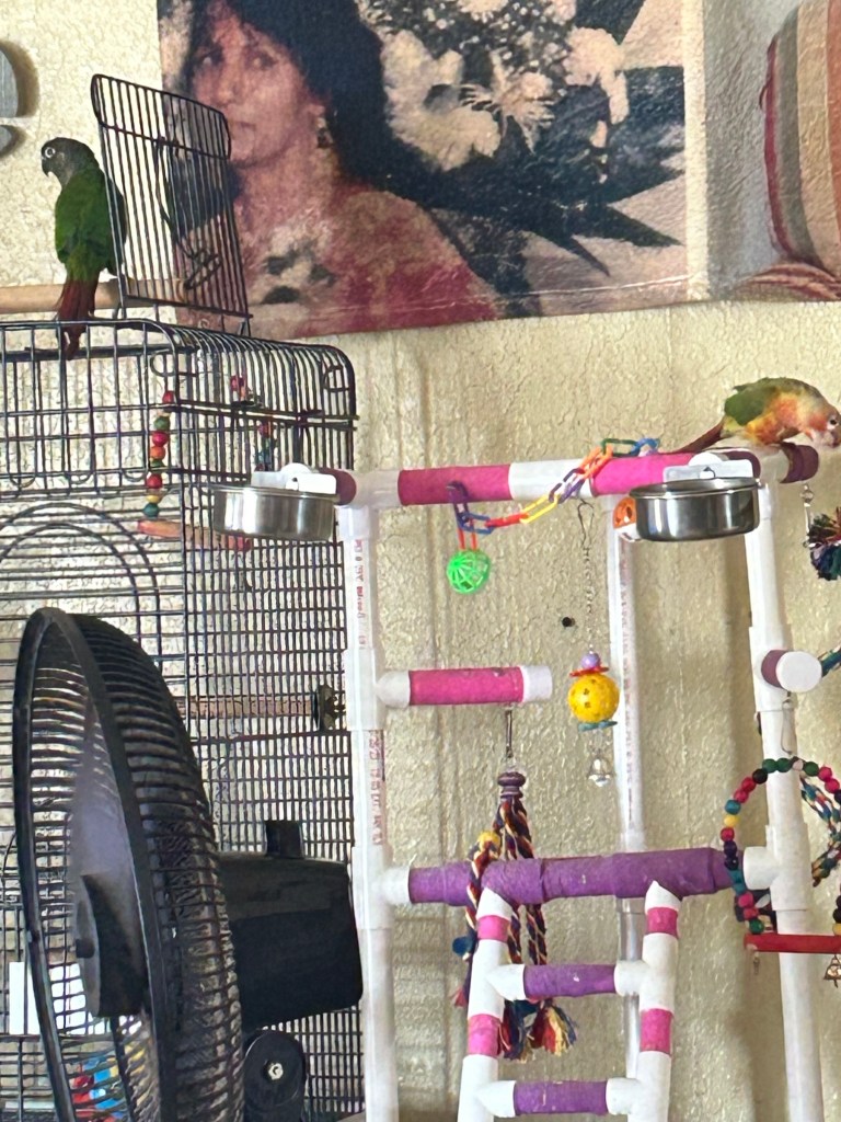 Scarlett and Max also enjoy playing on their homemade play gym. However, Wicca only seems to enjoy playing on her rainbow swing with moveable round pieces. Once in a while, Wicca allows both of the conures to play on it too. She is a loner mostly, but she doesn’t fight with the other two birds either.